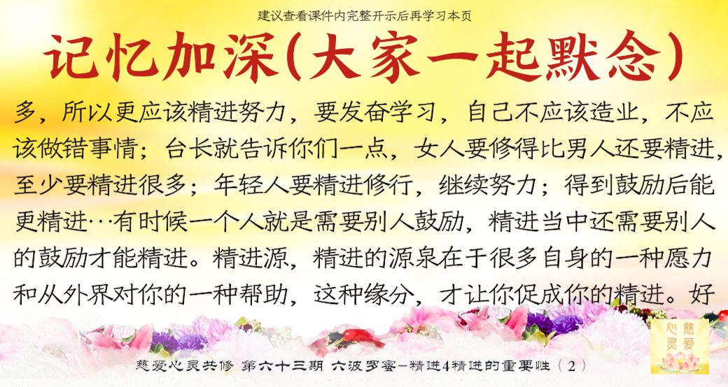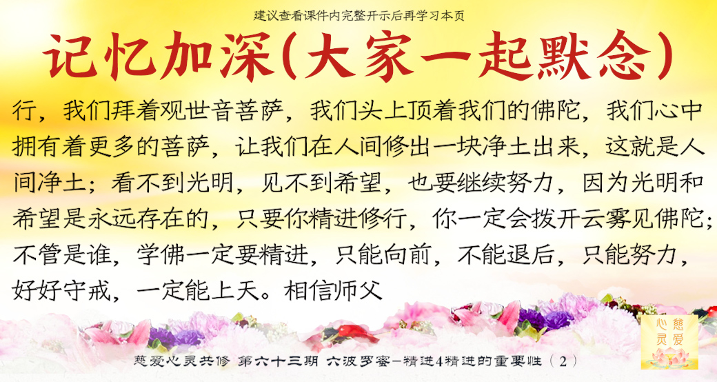 一个学佛的人天天在进步,他就不会退步,让我们所有的学佛人能够增加自己的精进心,努力修行,我们拜着观世音菩萨,我们头上顶着我们的佛陀,我们心中拥有着更多的菩萨,让我们在人间修出一块净土出来,这就是人间净土。