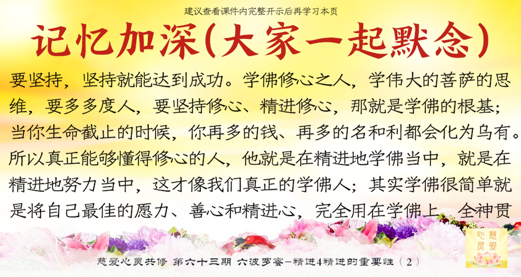 行善要及时,功德要持续,一个人几十年的生命,真正做人做事的时间很少很少,再勤劳的人也就做了自己一生的1/3呀!当你懂得人生真谛的时候,你会用你的智慧和毅力安排你的人生。这就是我们现在学佛人的人生,我们没有浪费,我们很开心。很多人不知道,一旦查出癌症了,医生告诉他只有三个月、六个月的时候,你知道他等于判死刑了,他才知道生命原来这么短给他。所以我们学佛人不可拖泥带水,前脚落地,后脚还不肯挪开呀。记住了,前脚落地,你后面那个脚就要忘掉它,赶紧往前走了。你的前脚就是你的今天,加紧脚步啊。你的昨天就是你的后脚,我们要把心专注在今天,而不能专注在昨天,否则你永远走不出来你的人生的坑坑洼洼的泥泞小道。所以要学会往前,精进努力学习,把自己的慈悲心修出来,把自己以快乐、慈悲、同情心、谅解心、容忍心、宽心、爱心、悲心全部修出来,把这些善良的像一朵一朵的莲花一样全部贡献给世人。让别人快乐的人你一定快乐,让别人难过的人你一定会伤心,你让别人瞋恨你一定会受苦。所以我们要学,我们真的要学,我们要制止自己心中的罪恶,我们要跟自己心中的恶念作斗争,积极地用善良的心念去改变自己。所以希望大家好好学佛,好好修心,希望大家能够在学佛当中认清人生的真谛,改变自己,让自己回到一个真我,学会真正地理解这个世界的真谛——那就是无常。
