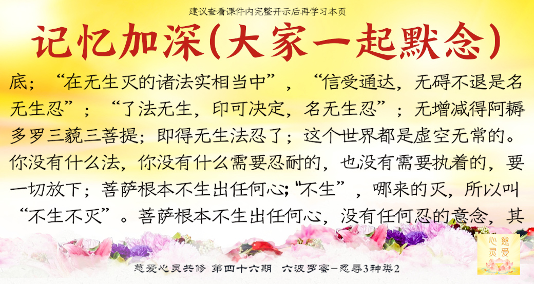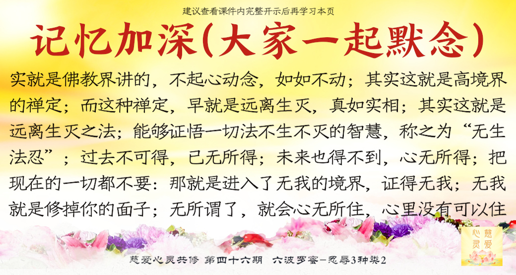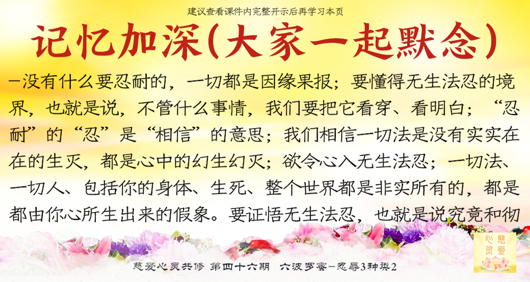 我虽然要忍耐,但是我连要忍耐的心都不生出来。根本认为没有生出的忍耐称为法忍。根本没有感觉要忍耐,才可能是无生。就是说,我没有感觉我要忍耐。很多人感觉自己要忍耐:“生气啊,不行,我一定要忍耐。我是学佛人,我必须要忍耐。你骂我好了,你打我好了,我就是要忍耐。”实际上这不是最高境界。你有本事,他骂你的时候你没有觉得他在骂你,他是在给你提高你境界的一个阶梯,就是一种增上缘,增加你上进的源泉。他给了你这个境界就让你进步更快。他骂你,你就听着,有则改之,无则加勉。因为在马路上还没有人来骂你呢。在家里他骂你,你就把他当成一种境界来看。这种忍耐实际上已经是一种法忍了,就是说没有忍耐的意思在里面。...师父让你们学佛就是放下自己,不要有面子。师父今天讲这个不好,讲那个不好,就是让你们学会忍耐。学到后来要无生法忍。阻碍境界提升是一堵墙。从某种意义上来讲,师父就是想把你们的这堵墙挖掉,因为你们的这堵墙把智慧挡住了。所以你就觉得痛了。
