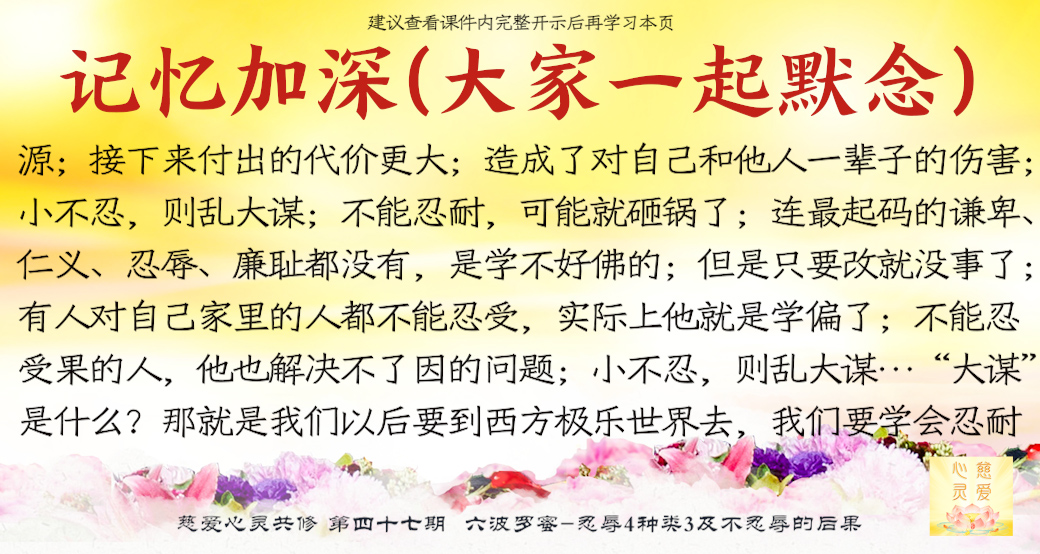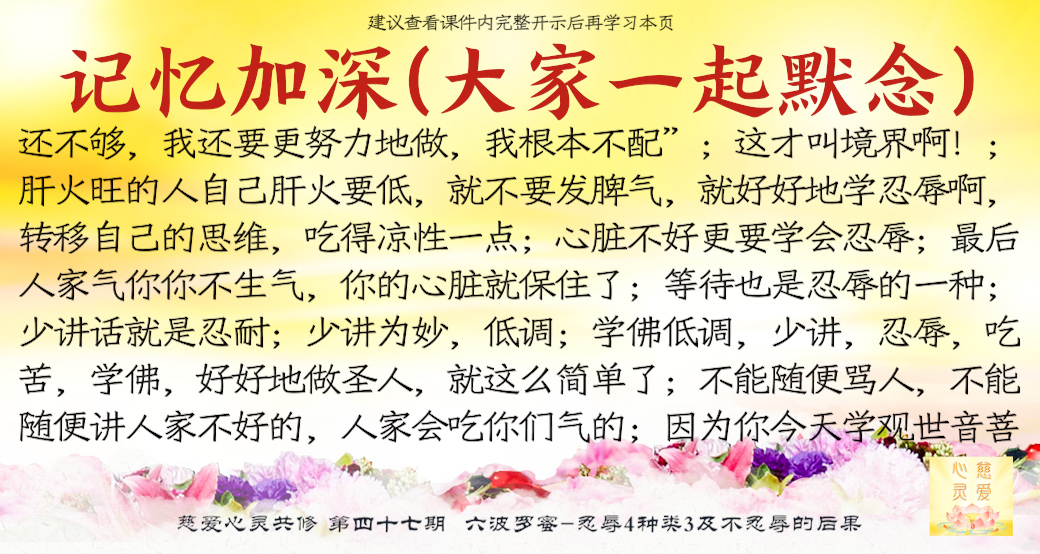 自己心中要有慈悲感,就是15分钟的时间,不管他们说什么话,能够学会忍辱精进。先要忍耐,毕竟他们是父母亲,我们学佛的人要万事孝为先。所以,先要忍耐,不要把他们当成魔。明白了吗?(对不起)以后有机会,等到他们开悟了、修心了,经常给爸爸妈妈念经,保佑他们身体好。经常跟爸爸妈妈说:“爸爸妈妈,我每天磕头就帮你们求身体好,希望爸爸身体好。”就是不相信的人,天天听女儿这么讲,他也会动心的。难道就给人家脸色看,“魔王又讲话了”?