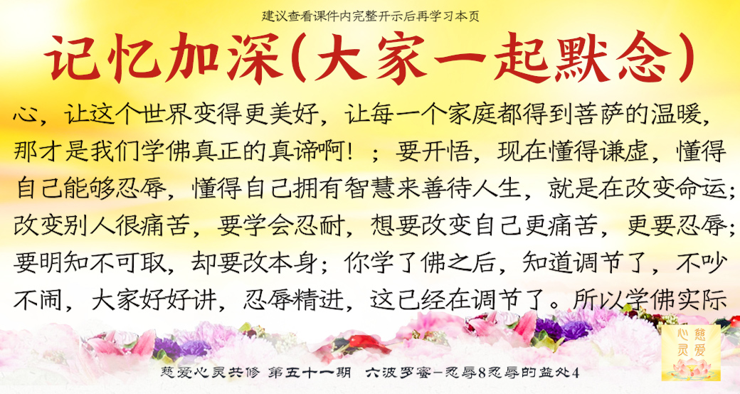 忍耐的人不会伤心,忍耐的人不会刺痛自己的心;不能忍耐才会失守,不能忍耐才会骂人骂到别人的祖宗。要学会珍惜,要懂得忍辱精进。想要保护好自己的心脏、肝脏和心灵,一定要懂得忍辱,学佛的忍辱心就是精进心。