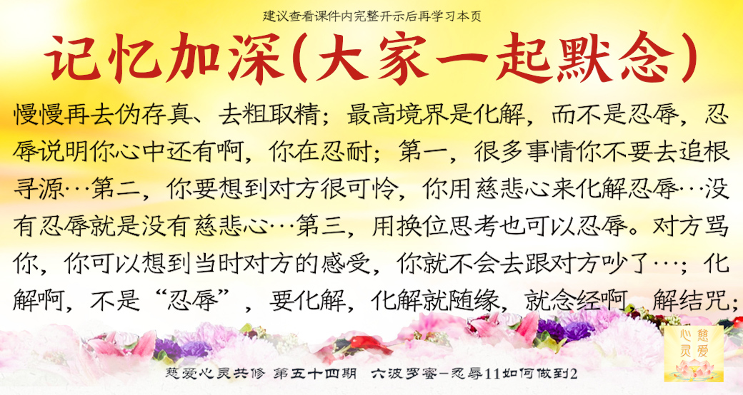 当然应该是“化解”了。“忍辱”不是最高境界,忍辱说明你心中还有啊,你在忍耐。“化解”就没了(是这样,听师父一说很简单了。什么时候能跟师父学到讲东西能讲得这么通俗易懂,感觉很简单就好了)对了,这就叫“智慧”,要学的是“智慧”。